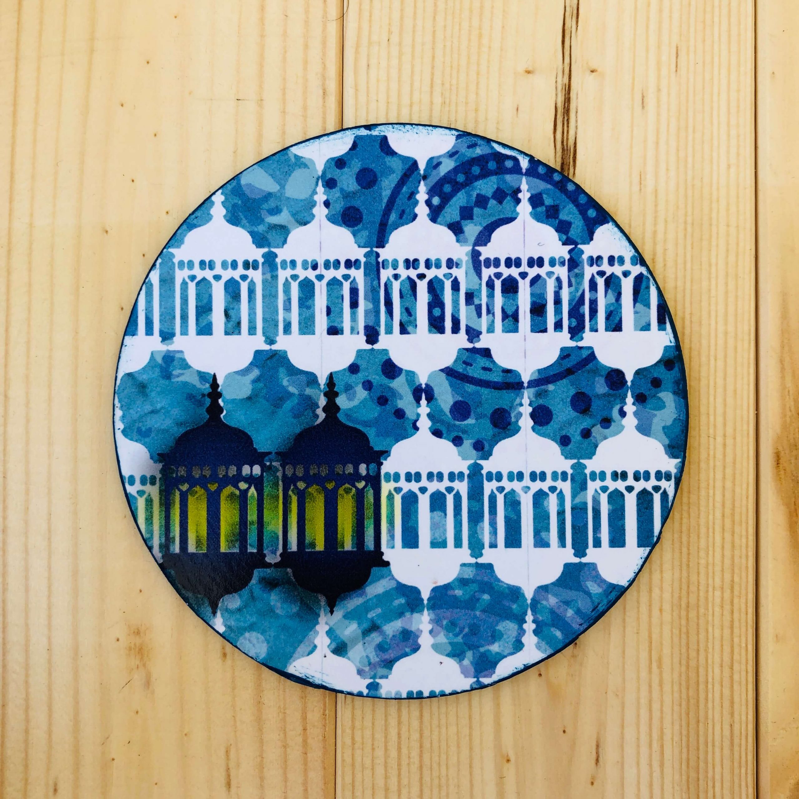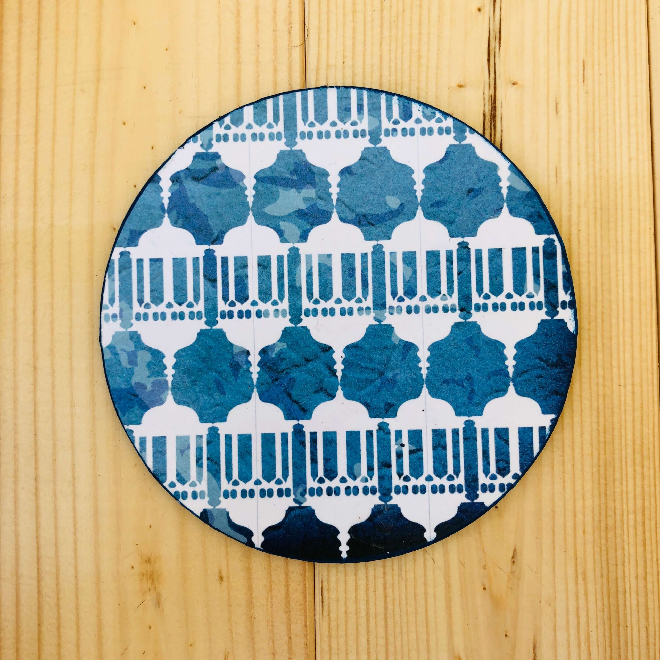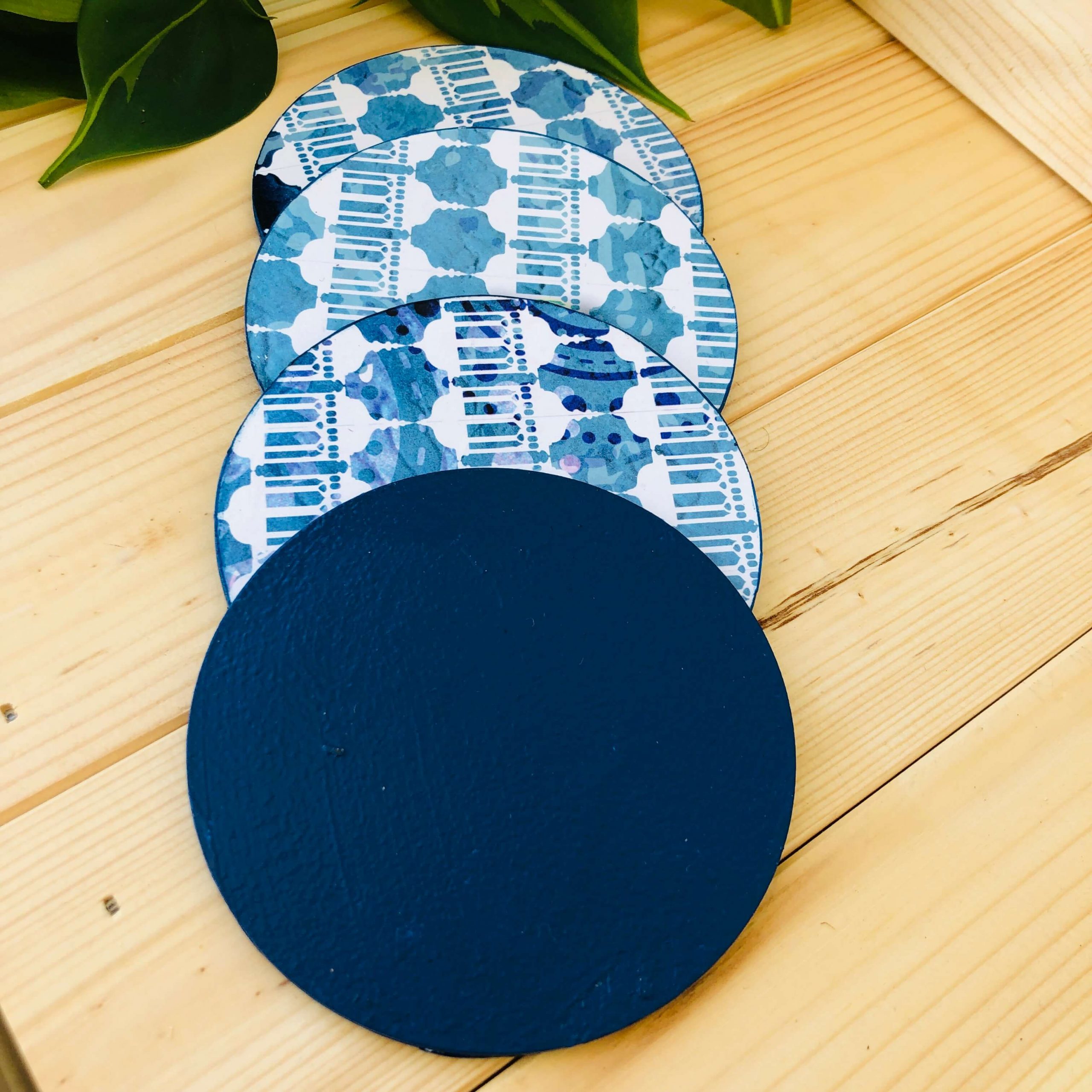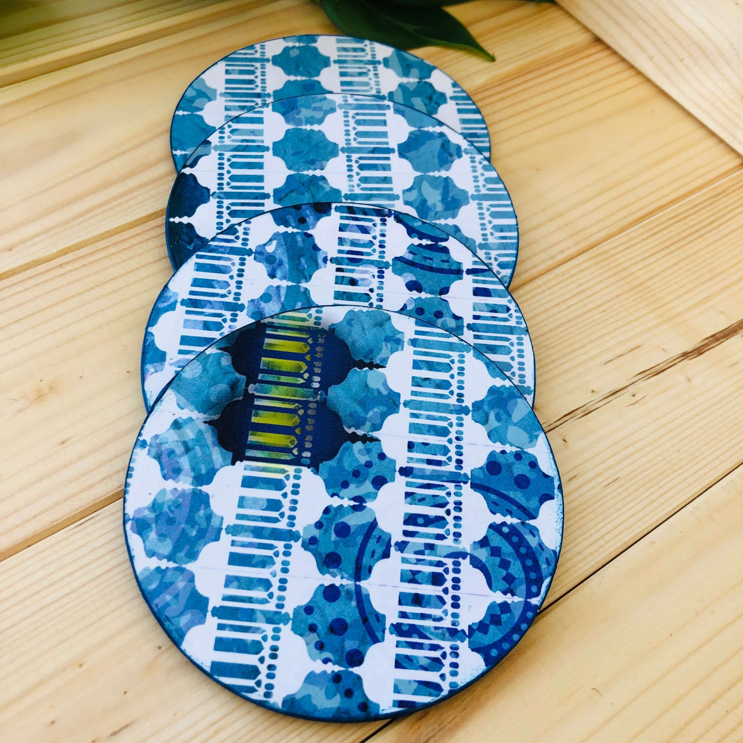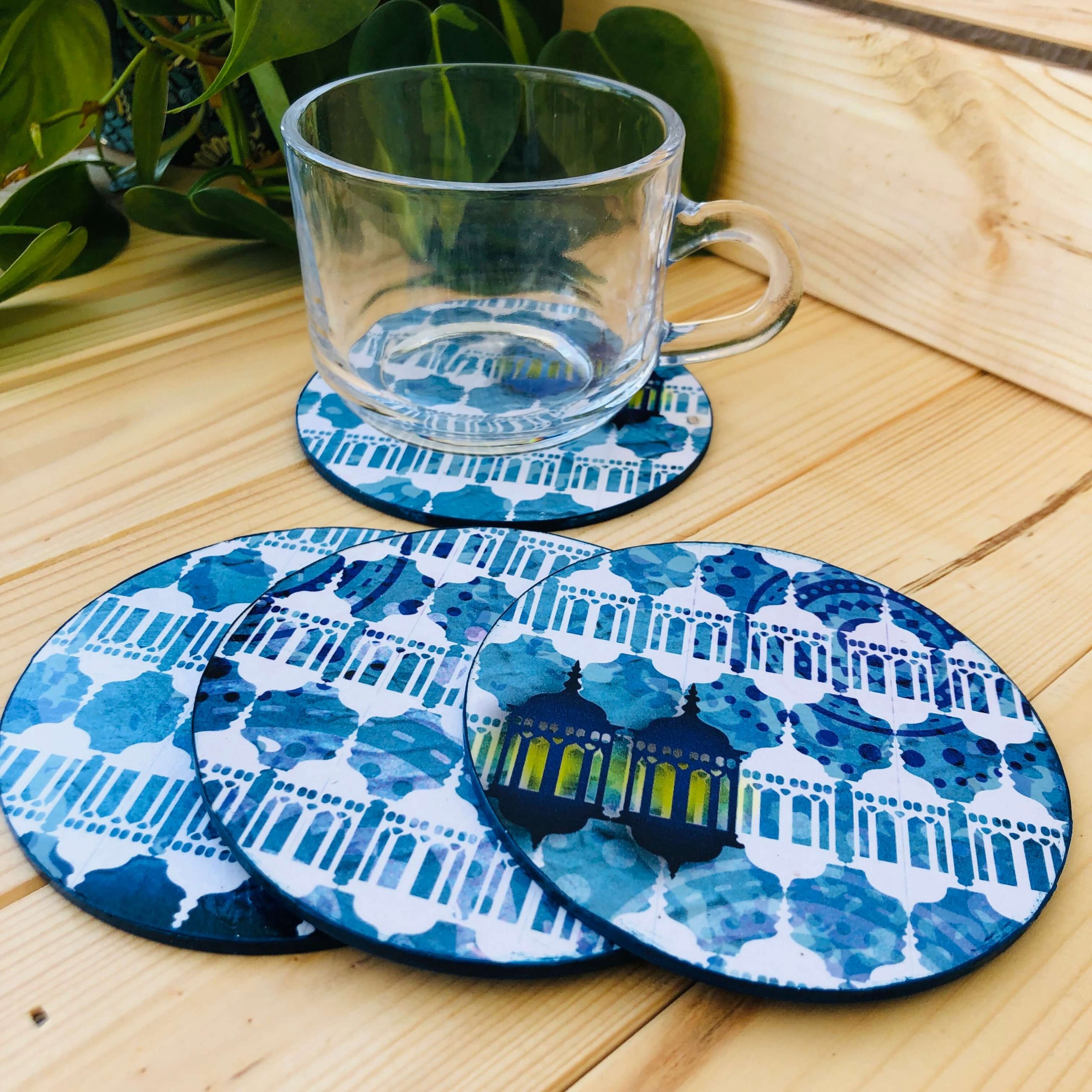 Handmade Wooden Coasters with Blue Lantern patterns. Ideal for wooden and glass dining tables.