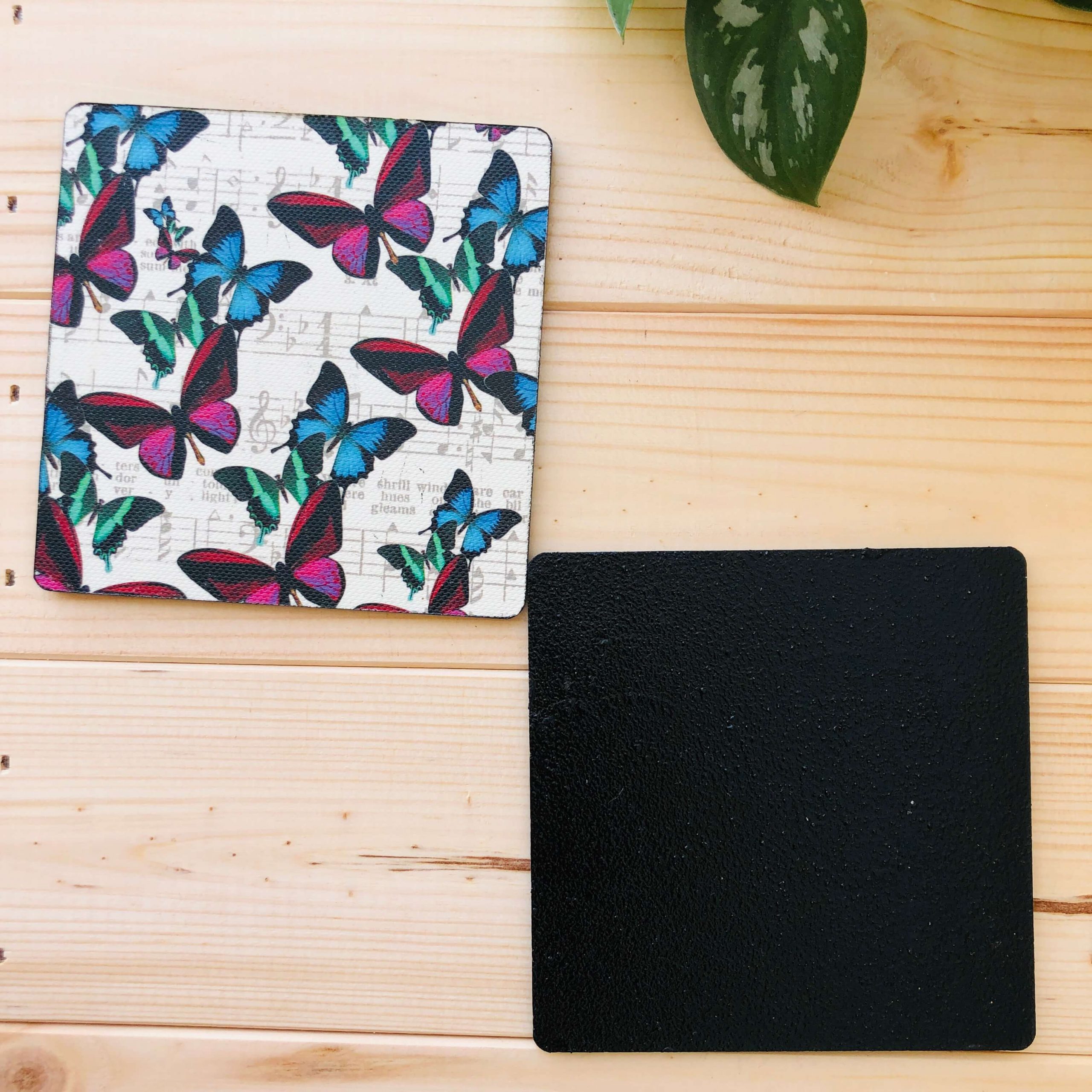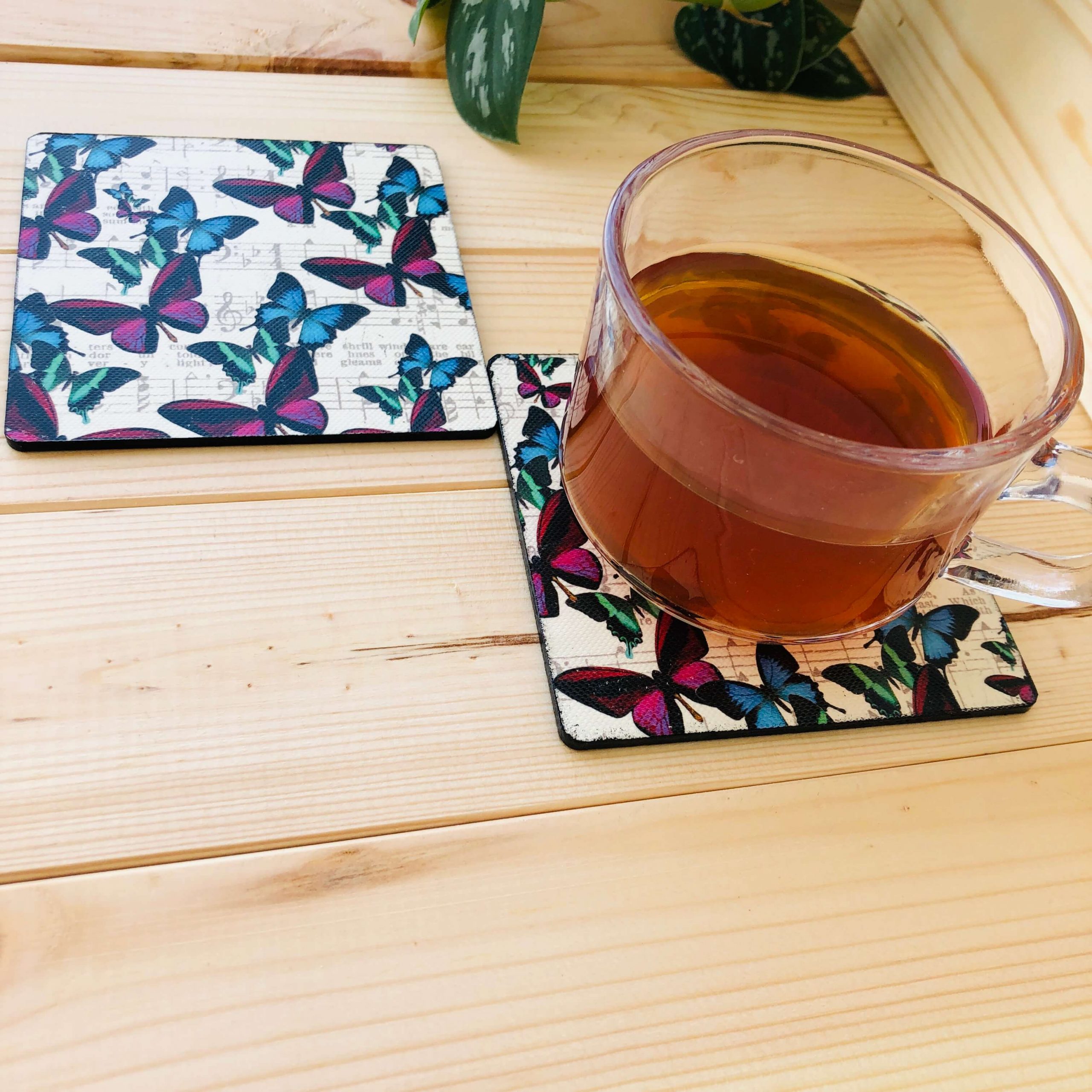 Handmade Wooden Coasters with dainty butterfly patterns. Ideal for wooden/ glass dining or coffee tables. It can be a great accessory for an office table.