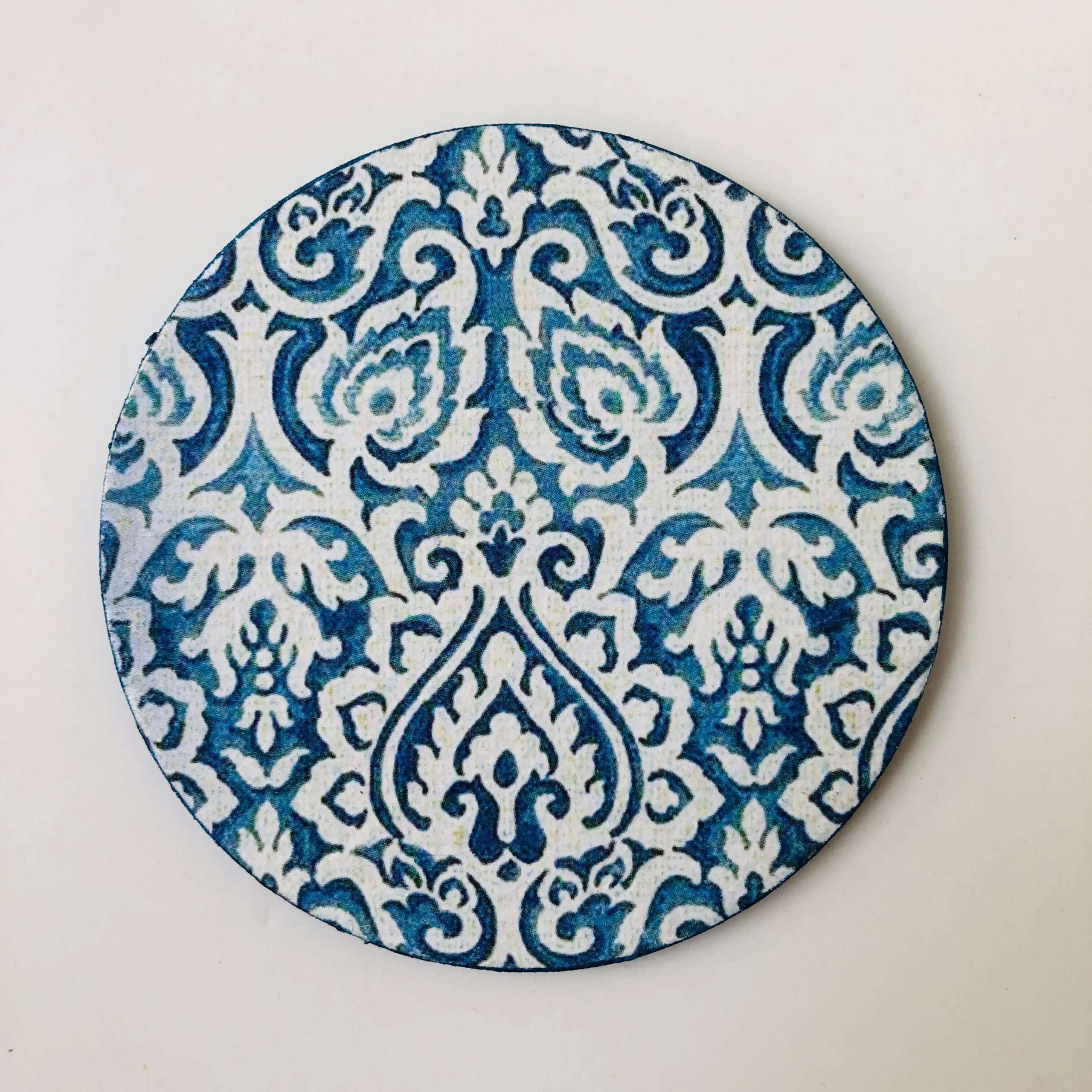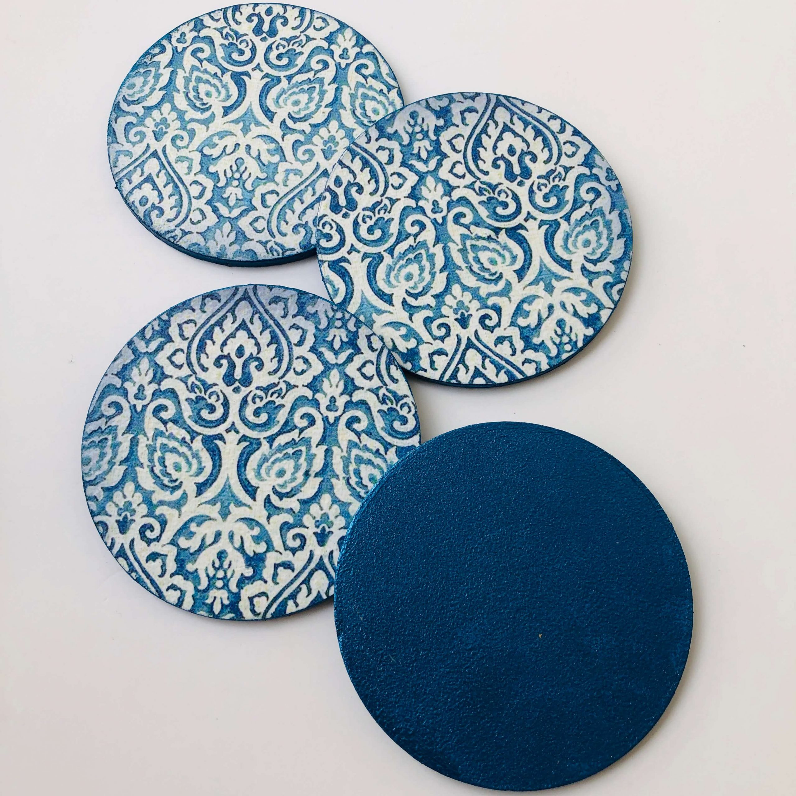 Handmade Wooden Coasters designed with intricate floral motifs in blue . Ideal for wooden/ glass dining or coffee tables.