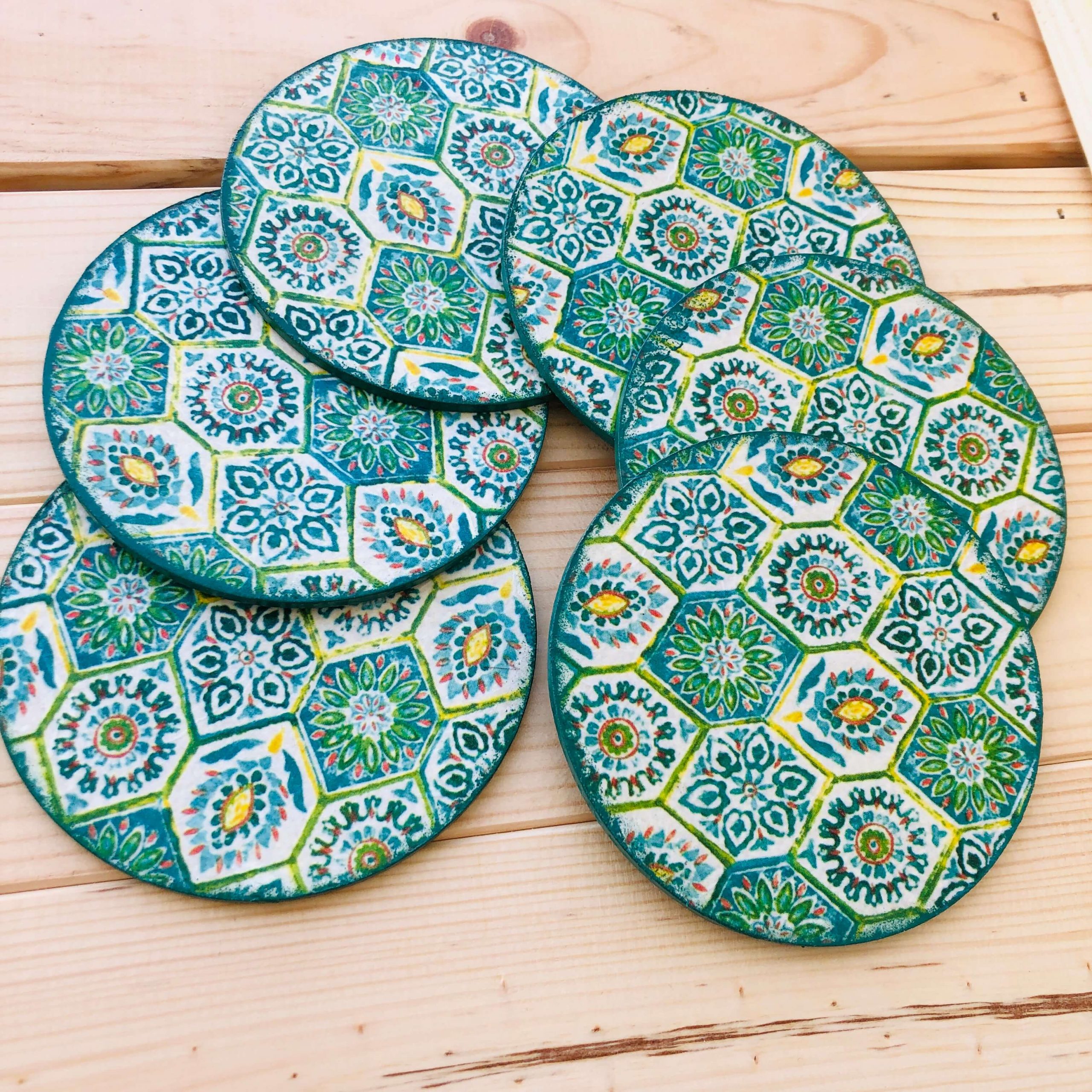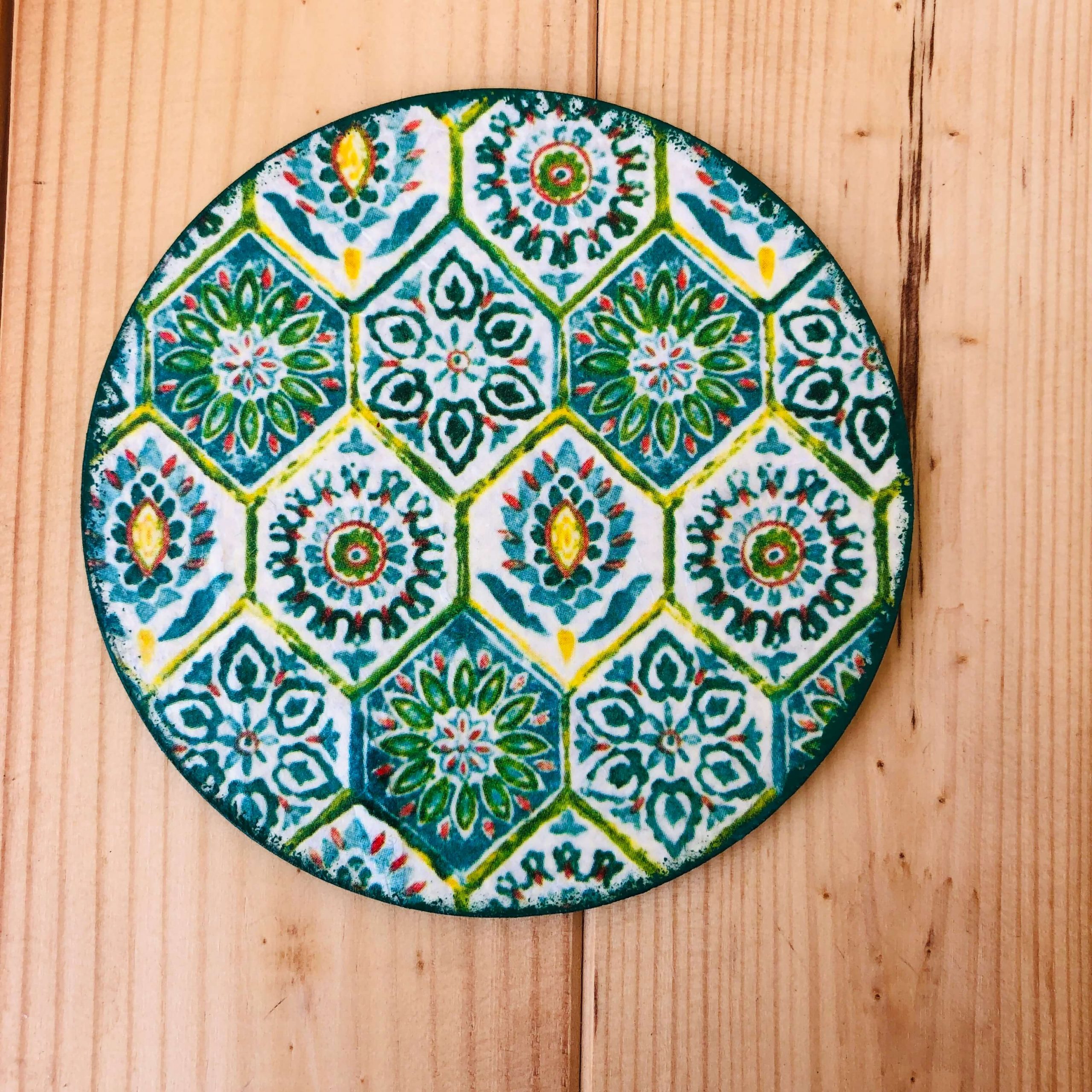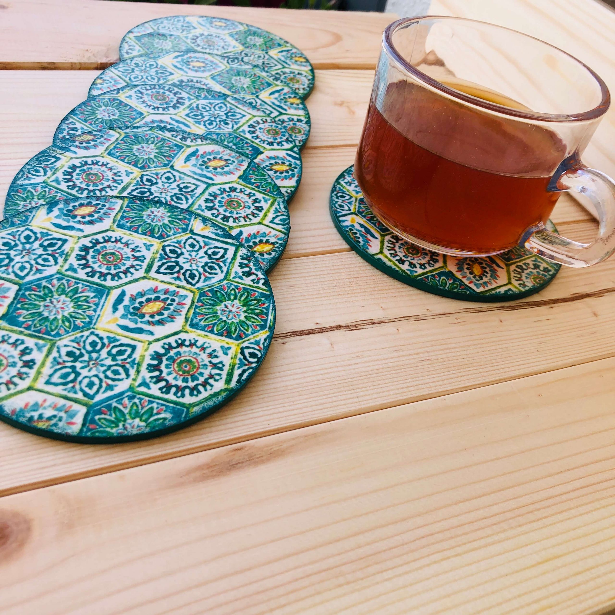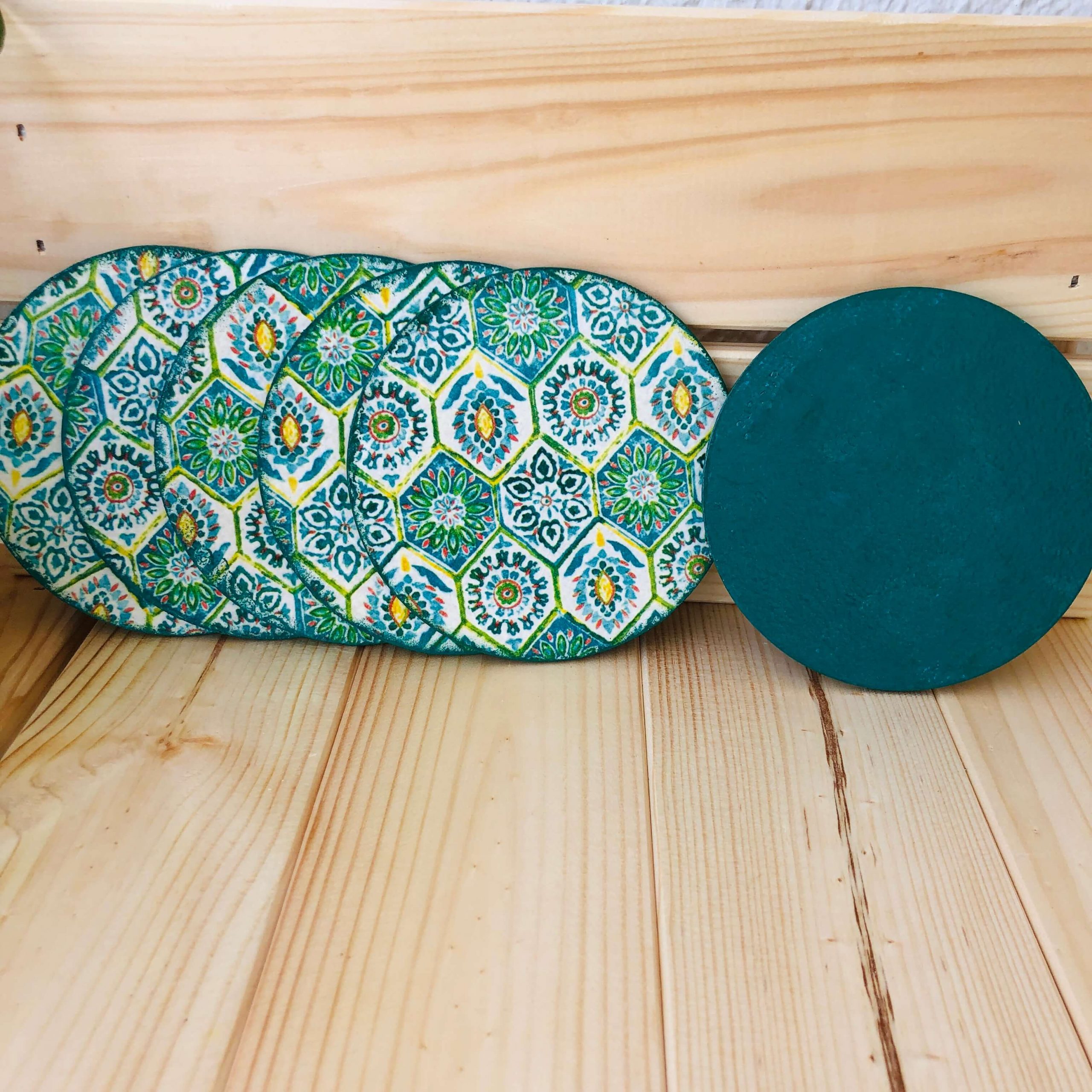 Handmade Wooden Coasters with floral mosaic patterns. Ideal for wooden and glass dining tables.