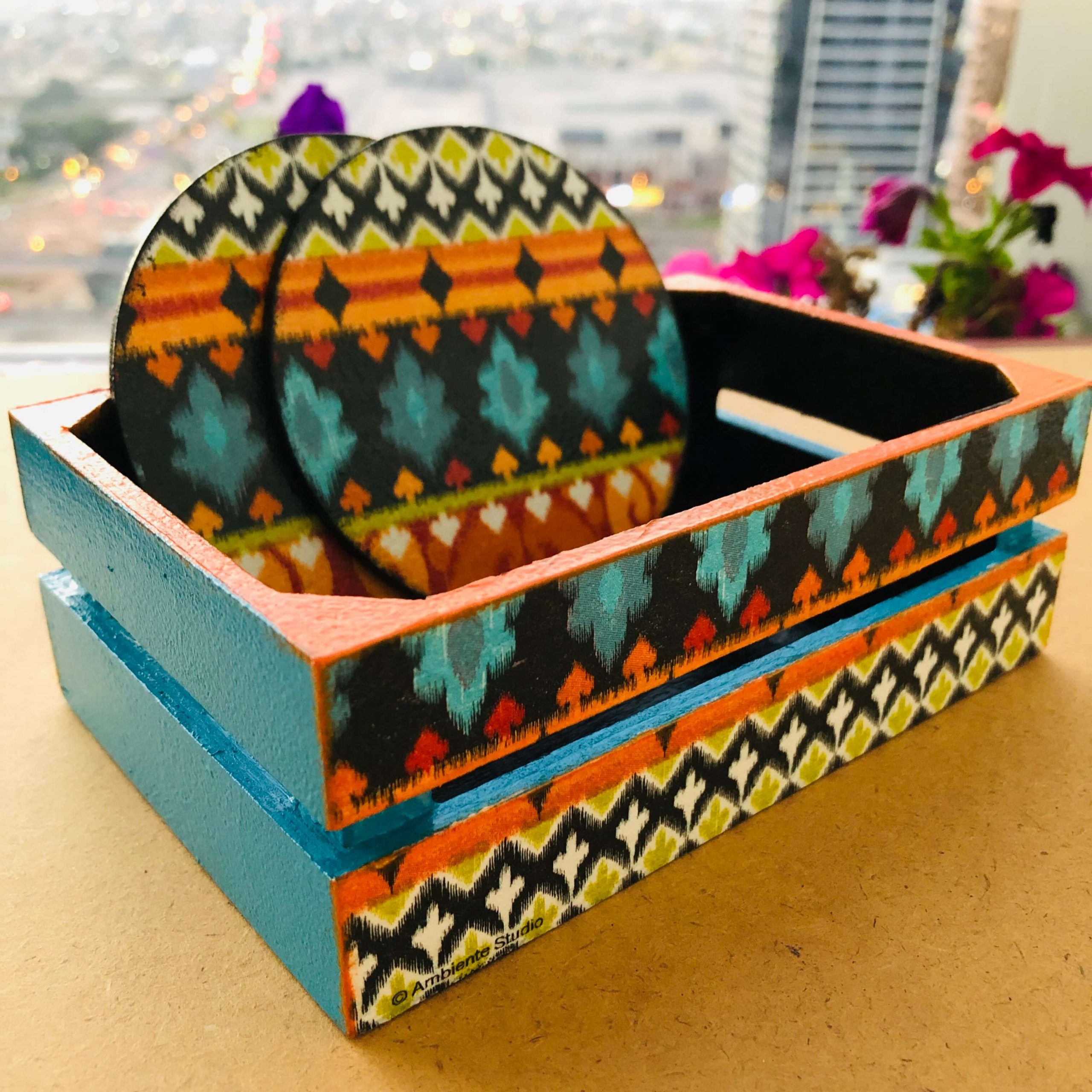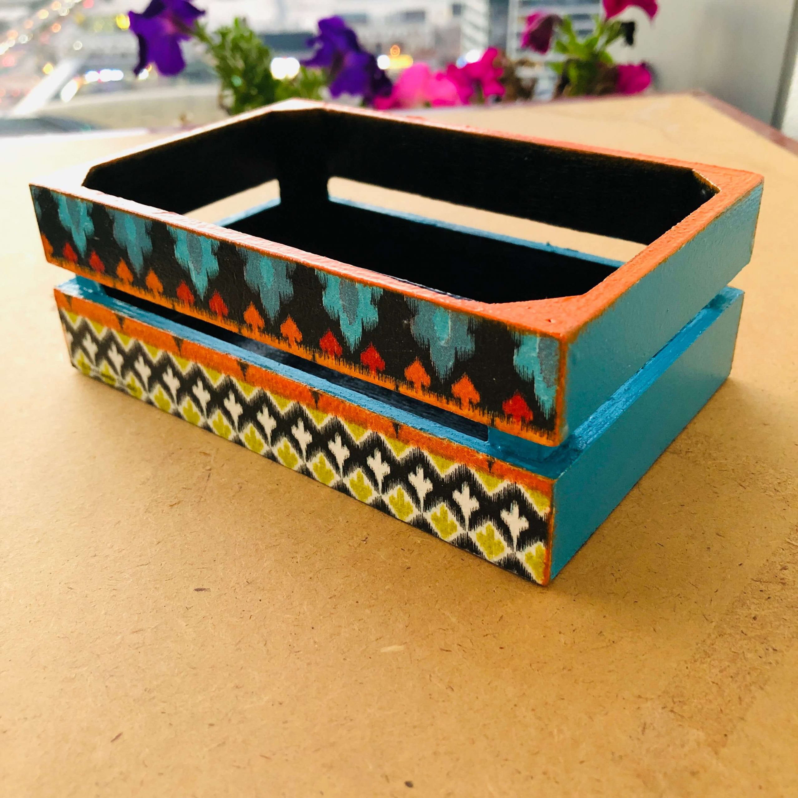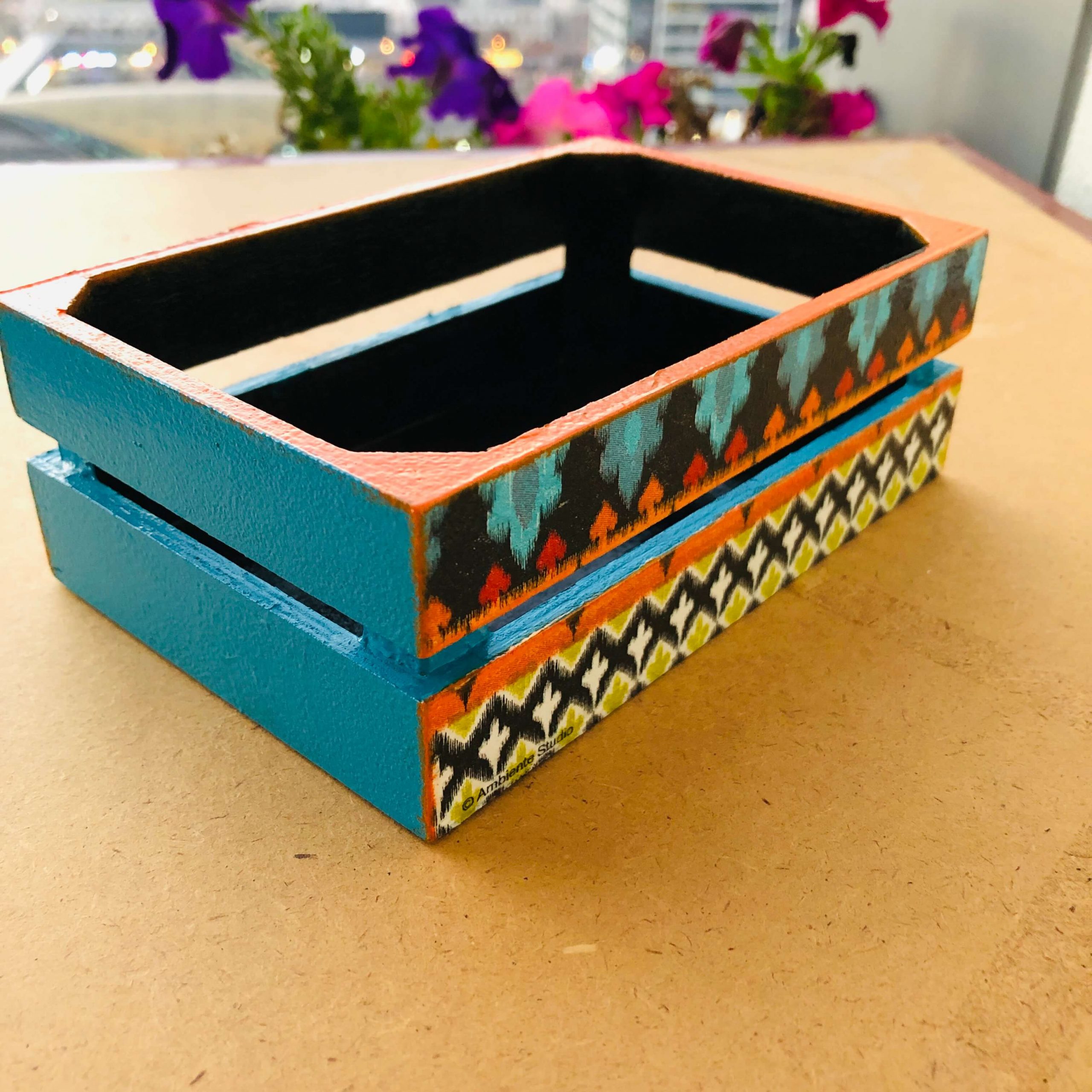 This is a multipurpose wooden crate embellished with Ikat designs. Suitable for storing trinkets, small jars and even as a planter.